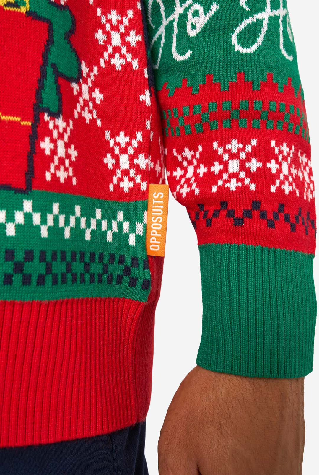 • Lachende man in een kleurrijke gebreide kersttrui met de Kerstman, Rudolph en de tekst "So Jolly".