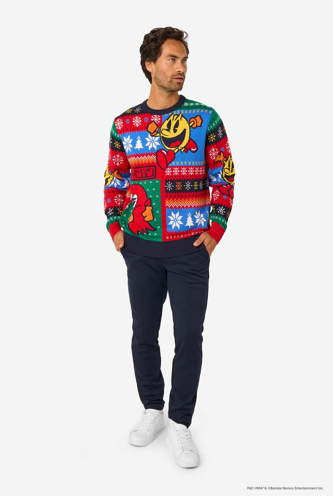 Geef je kerststijl een boost met deze gebreide PAC-MAN kersttrui! Met de iconische gele held en zijn kleurrijke spookachtige rivalen is het een speelse mix van retro arcadeplezier en feestelijke sfeer. Zacht, knus en onweerstaanbaar: deze trui is perfect voor iedereen die graag klassiek blijft, maar toch opvalt aan de kersttafel. Geef je krachten de vrije loop, verspreid wat kerstsfeer en laat iedereen zien dat Kerstmis geen spelletje is... of misschien toch wel.