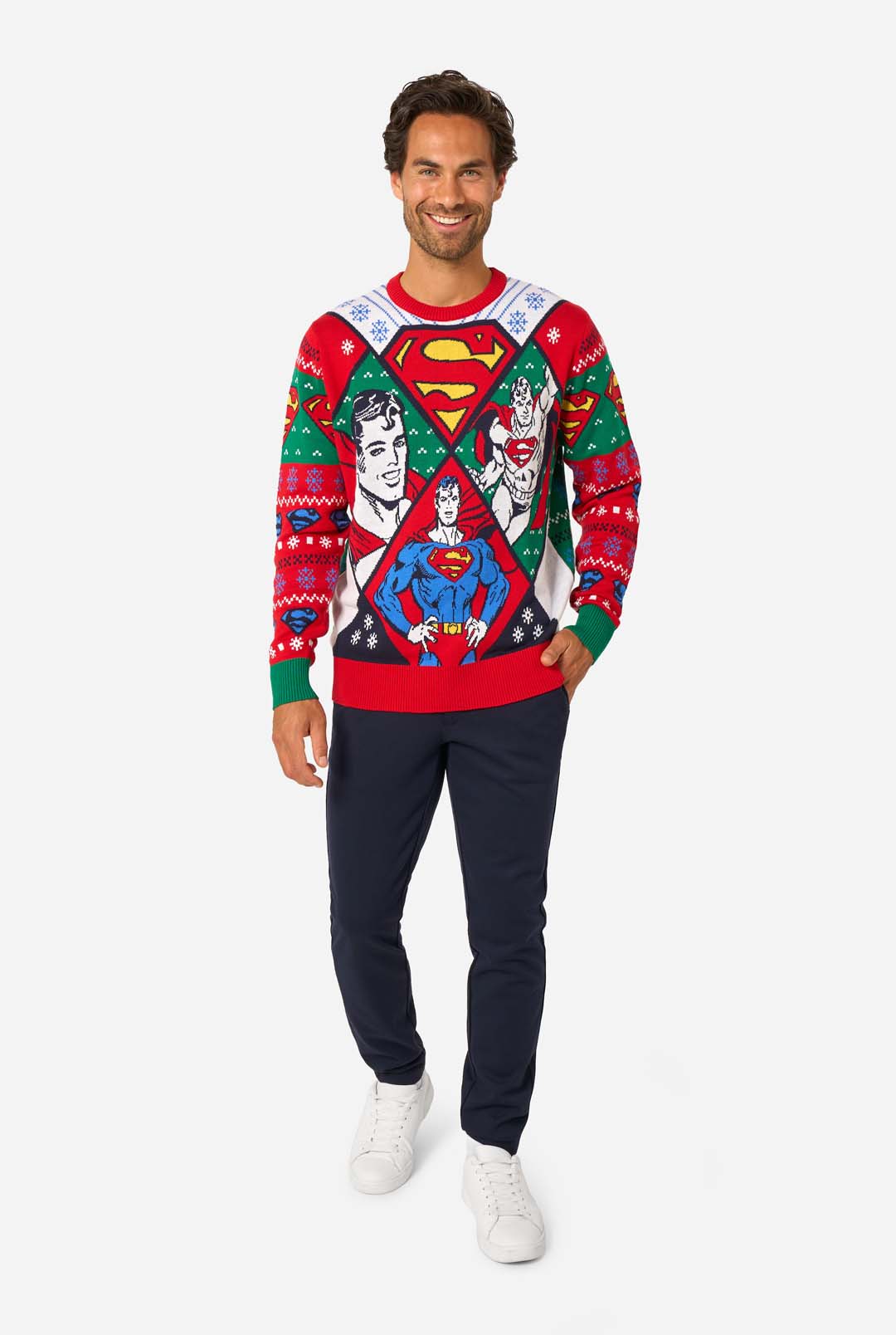 • Man in een kleurrijke gebreide kersttrui met verschillende Superman-prints en het iconische “S”-logo.