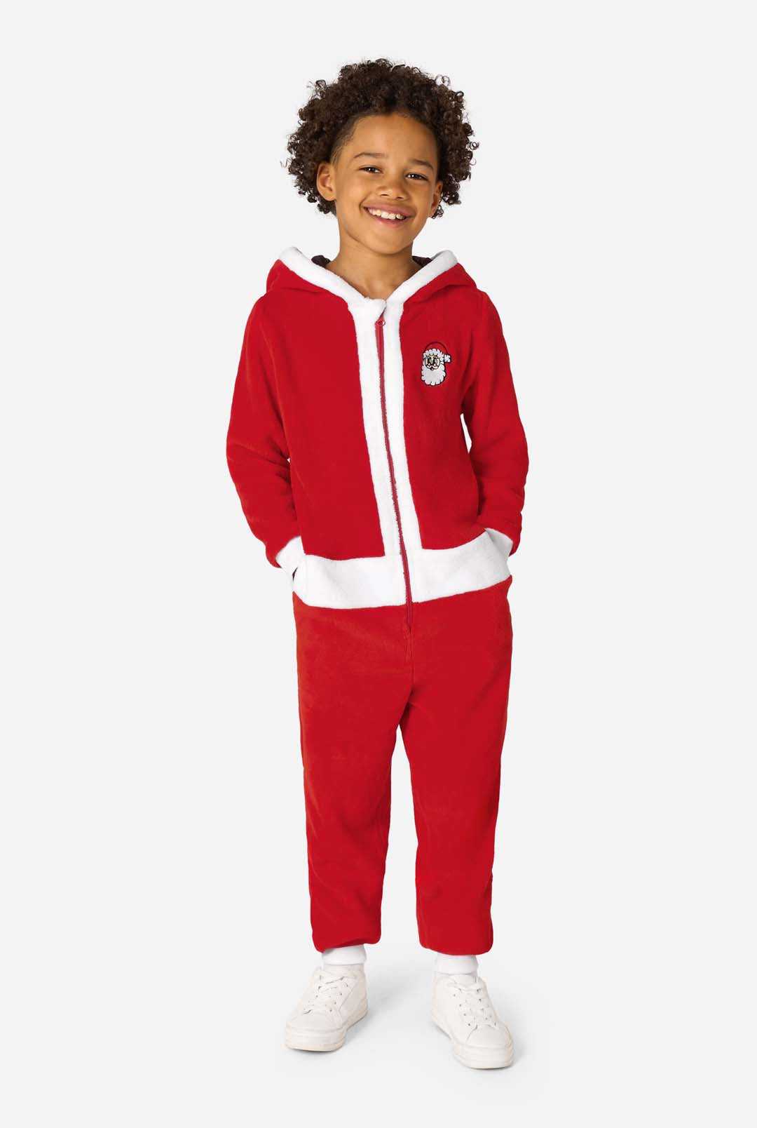 • Kind dat een rode Santa-onesie met een wit afgewerkte capuchon draagt, iets zijwaarts staand met de handen in de zakken.