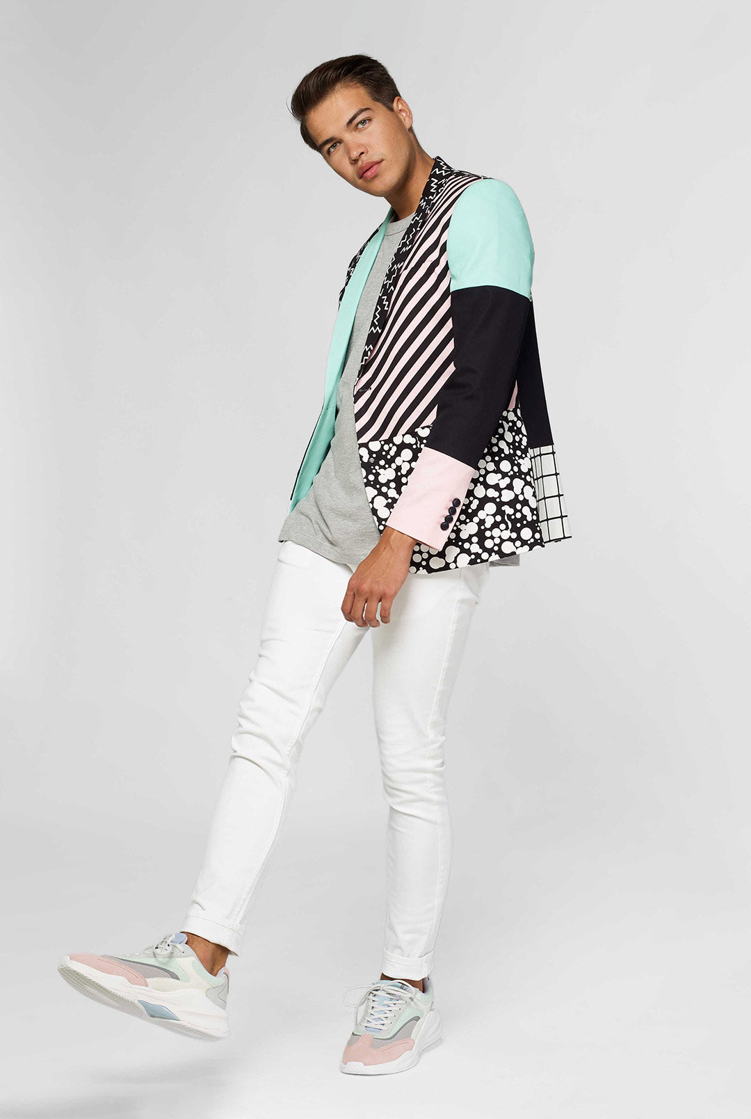 Cut&Sew is ons eerbetoon aan het iconische postmoderne 80’s designcollectief Memphis Group. Ben je een old school guy, gevangen in een moderne wereld? Breng de stijl van ‘jouw’ tijdperk terug en maak een fashion statement met dit item uit de OppoSuits Deluxe collectie. Het is een blazer van een hoge kwaliteit katoen-mix, met verschillende retro kleuren en patronen.