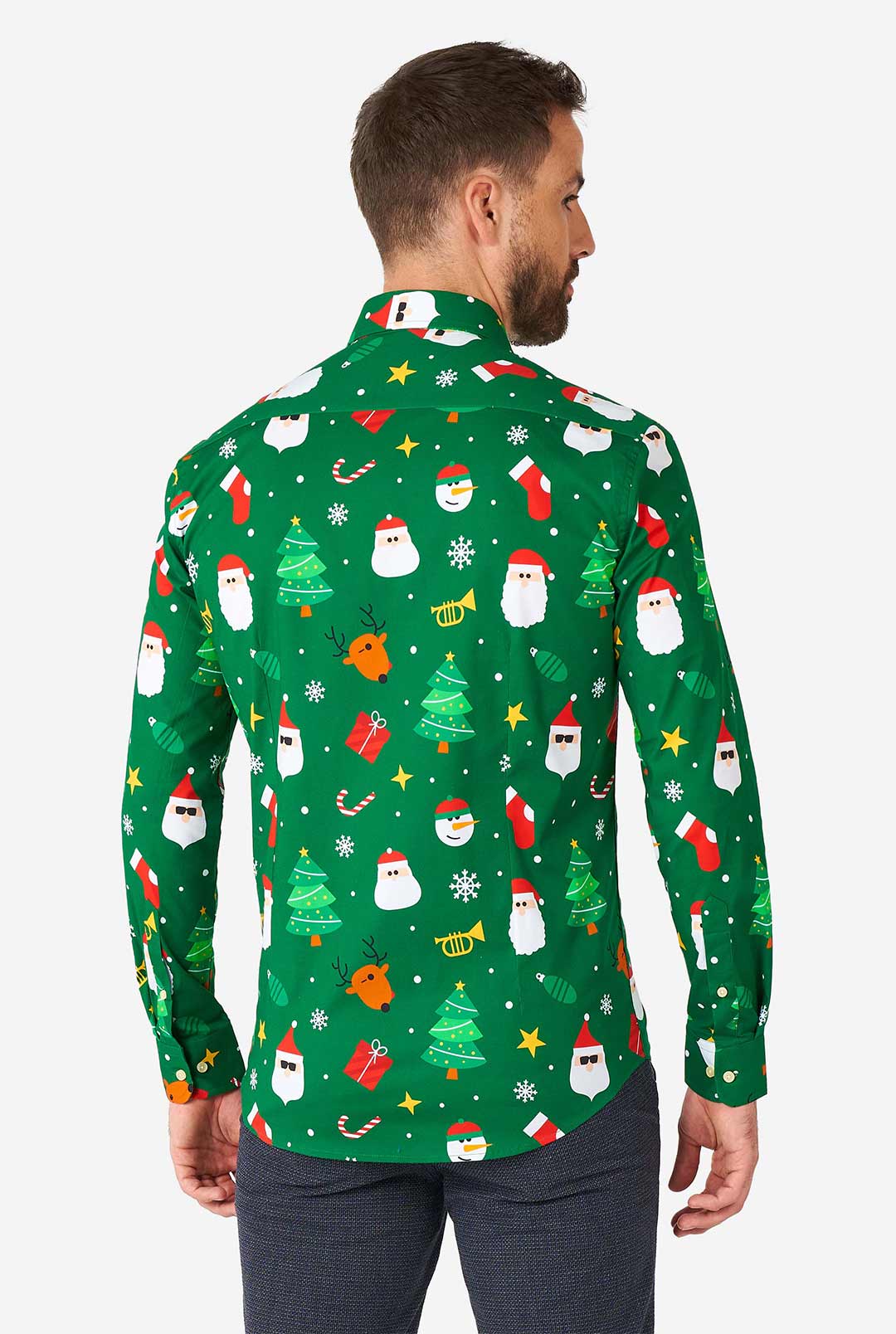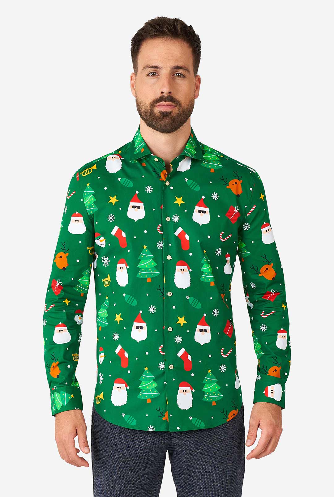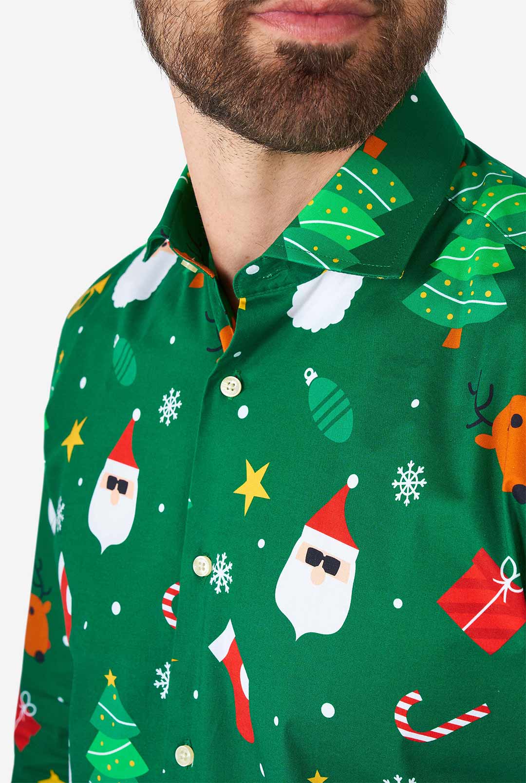 Kerst is ieder jaar weer het meest gezellige en knusse feestje van het jaar. Als je behoefte hebt aan een feestelijke look voor de kerstdagen, zoek dan niet verder dan het groene Festivity kerstshirt. Het heeft kerstmannen, rendieren, kerstbomen en glinsterende sterren en is perfect om te dragen onder een stijlvol pak. Je hoeft het alleen maar te dragen!