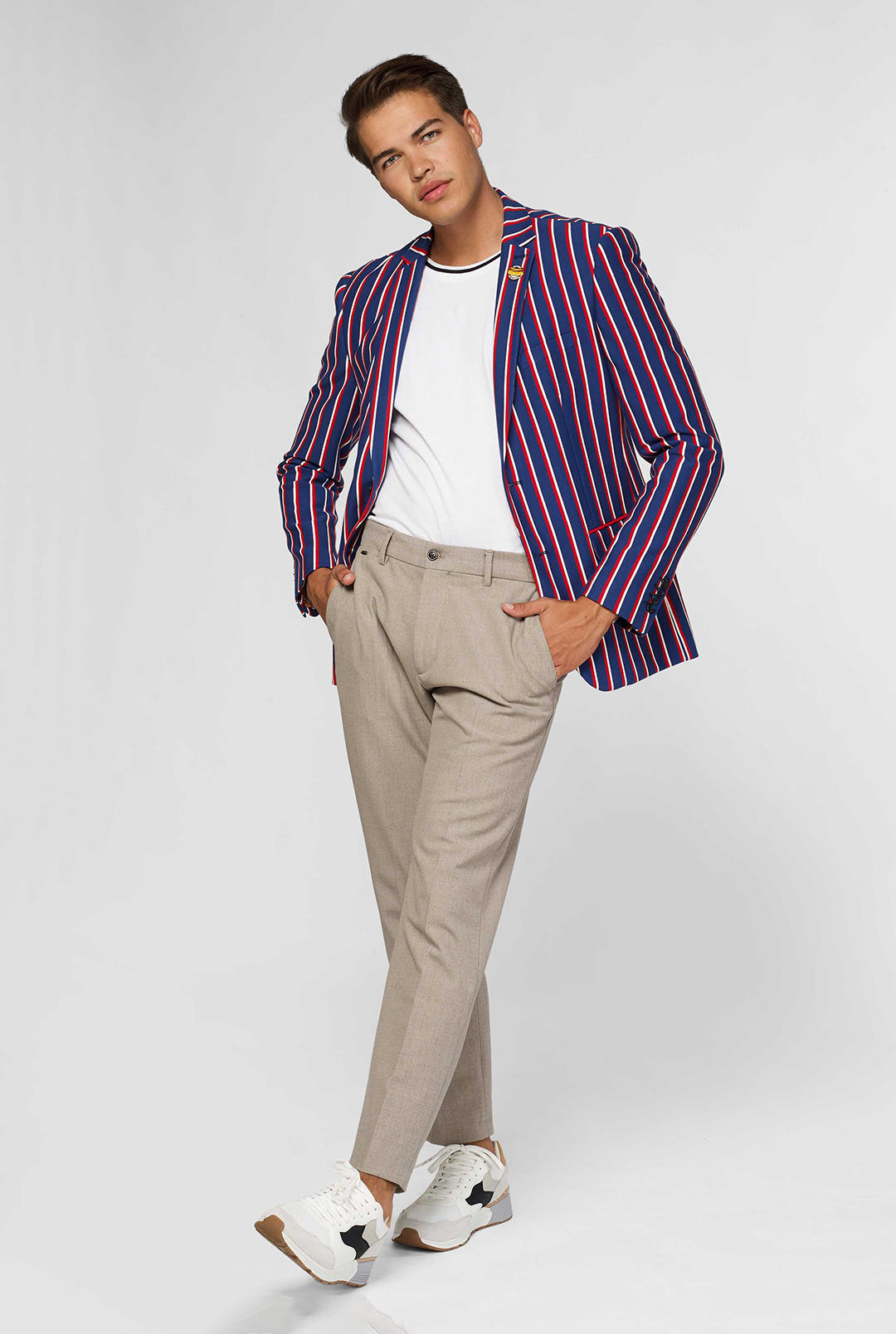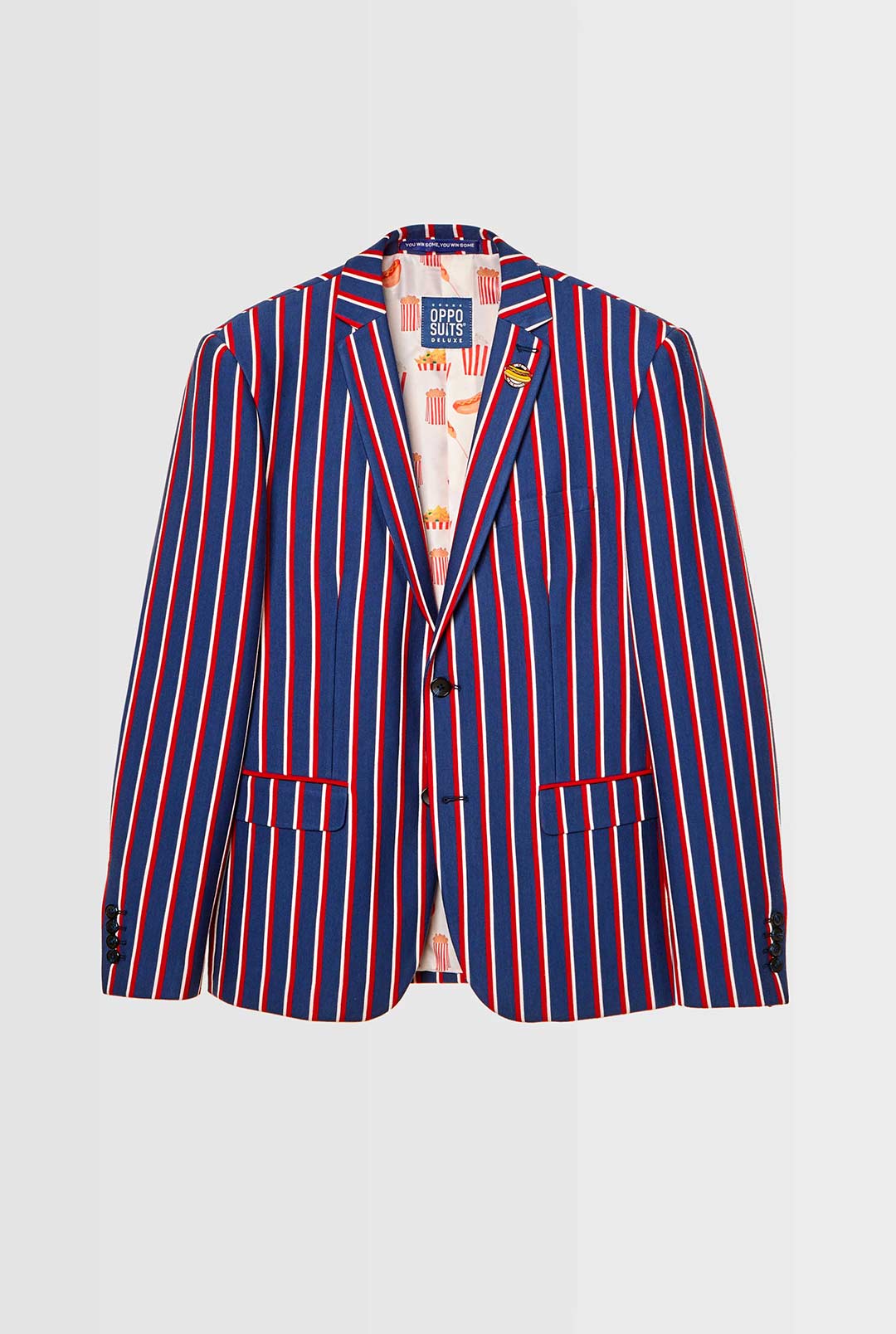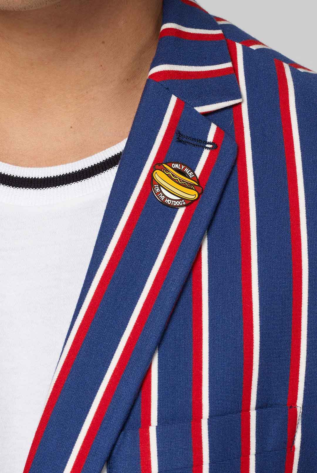 Jouw favoriete sportteam en Amerika aanmoedigen is nóg leuker als je het in stijl doet. De Cheer Stripe blazer is geïnspireerd op de elegante kledingstijl van buitenlandse paardenraces en heeft een klassieke streep met een moderne twist en een afneembare pin. Het OppoSuits Deluxe jasje is gemaakt van een dubbelgebreide jersey met een beetje stretch, waardoor jij zowel stijlvol als comfortabel kunt juichen.